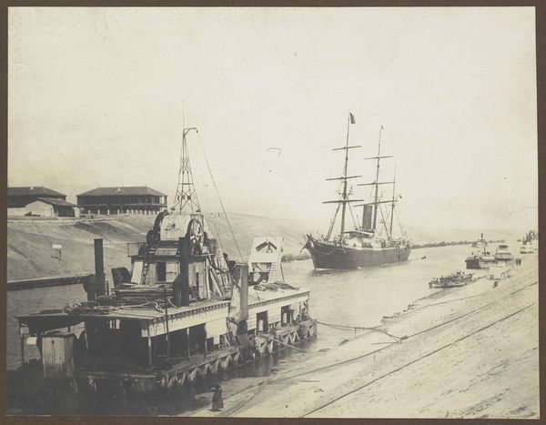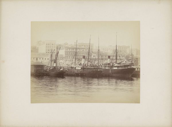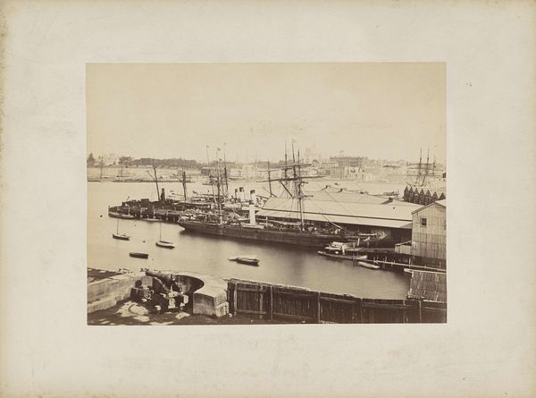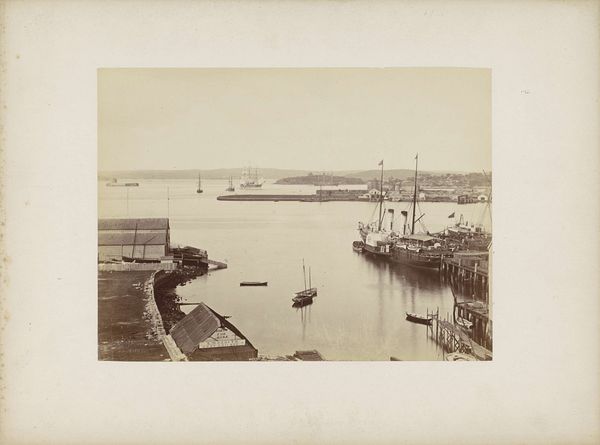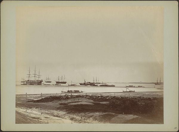 Curator: Standing before us is Gustave Le Gray's "The Jetty at Sète," a silver print from 1857 currently residing here at the Art Institute of Chicago. Editor: It's like stepping into a faded memory. I immediately feel a sense of stillness and melancholy, almost a yearning for a time that’s long past. The sepia tones feel like a veil, and the composition, with the dominating jetty and the clustered ships, whispers stories of departure. Curator: That sense of melancholy really gets to the heart of Le Gray's approach, I think. Incredibly, he combined two separate negatives—one for the sky and one for the sea and land—to overcome the technical limitations of capturing both with detail at that time. Editor: Ah, that explains the seamless transition. The sky feels infinite and rather bleak, a perfect mirror to the sea of emotions that it invokes. What strikes me too is the use of sailing ships, all nestled closely at harbor. What could that harbor symbolize? Is it safety or maybe constraint, a pause before they must again depart? Curator: Given the date, one could interpret the imagery through the lens of France's colonial ambitions and maritime power. Ships were, after all, potent symbols of connection, trade, and often, conquest. That building, on the right is no accident. It seems as though he composed all his images to evoke certain powerful feelings. Editor: I think there’s also a profound reflection of impermanence. Le Gray managed to capture something truly enduring, and now over a century later, his picture causes us to see into the world that was... and can't be, because change itself is at the heart of life. The sea is forever flowing! The ships depart and bring about changes elsewhere... so the image stands at a doorway, reflecting that moment of departure, the place on a boundary. Curator: It's remarkable how one image can hold so much, both technically and conceptually. I see a certain striving, maybe a bit melancholy as you say, but there's peace also. Editor: Yes! The picture's aged look suggests the enduring human spirit despite facing change; as time passes everything and everyone shifts— the sepia tone provides context—it offers hope in change. Curator: A powerful meditation, wouldn’t you agree? Editor: A timeless echo, definitely.