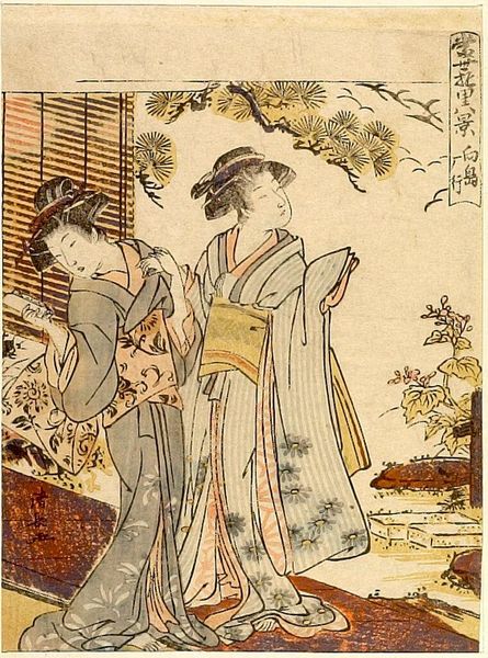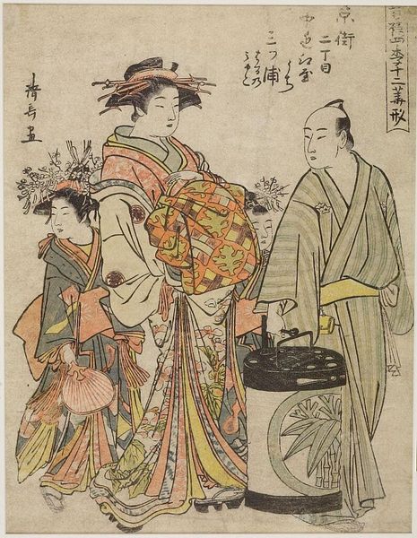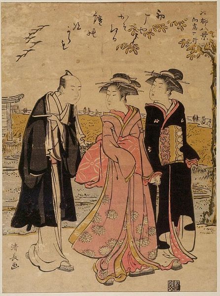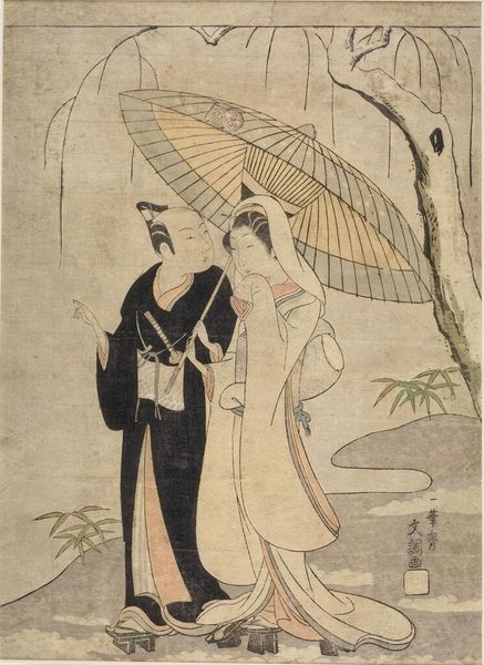 Editor: Here we have Torii Kiyonaga's woodblock print, "Evening Snow in the Late Winter." I’m struck by the stillness, that pause before spring. What symbols stand out to you? Curator: The lingering snow itself is a potent symbol. It represents not just the season, but the transient nature of beauty and the bittersweet acceptance of endings. Notice how the plum blossoms persist despite the cold? What does that resilience evoke for you? Editor: It feels like hope, maybe, even in the face of hardship? Curator: Precisely. Kiyonaga uses these visual cues to tap into deeply ingrained cultural associations. The woman with her pipe, the man with his scroll... they’re contained, reflective. The imagery invites contemplation, don't you agree? Editor: Definitely. I hadn't considered how much the setting contributes to the overall mood. Thanks for pointing that out!