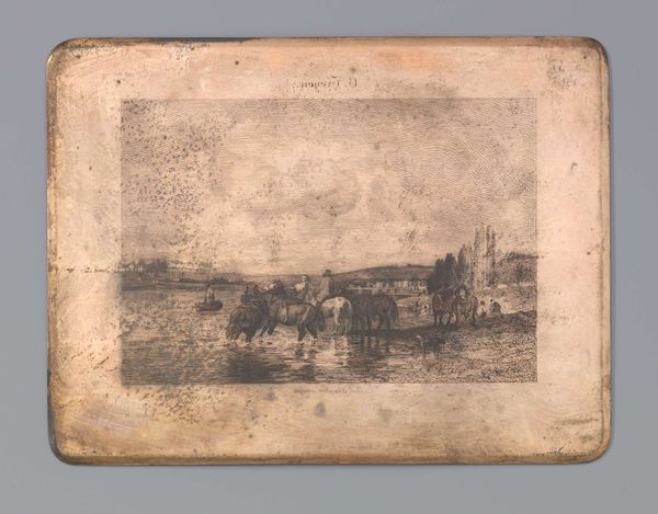 Curator: At the Rijksmuseum, we have Dirk Jurriaan Sluyter's *Winterlandschap,* dating from 1821 to 1886. It's rendered primarily in watercolors. Editor: The copper plate immediately strikes me. It gives the watercolor an aged quality, like an artifact recovered from centuries past. You can almost smell the damp earth and frosty air. Curator: Yes, it possesses that feeling doesn't it? Sluyter worked in the Romantic style, imbuing landscapes with a sense of awe and perhaps even melancholy. Winter scenes often symbolize reflection or the passage of time. Editor: Right. But there's more than melancholy here. Look at the surface itself. The blotches and variations in the copper patina create an abstract border. They emphasize process: the artist's touch, the unpredictable nature of materials. There’s an undeniable tension there. The smooth application of the watercolor against the corrosive nature of the copper. Curator: Indeed, copper also holds potent associations. The alchemists linked it with Venus and emotions related to love. This adds a complex layer. Winter, conventionally linked to coldness, is depicted on a metal symbolic of warmth. Editor: Fascinating point! The human figures almost blend in, but note how small and stoic they are in contrast to the wide frozen landscape. Do they add to the sense of isolation, or rather persistence against the bleakness of winter? Curator: The image may represent a cultural memory of rural life at a very precise moment. These daily labors also appear heroic set against nature's grandeur, the very image evokes that sense of communal memory, or resilience against the elements. Editor: The fact that it is worked onto this aged looking copper really is perfect. It isn't simply representational; the medium embodies the artwork's emotional core. Curator: Quite so. These images speak to us beyond the surface, engaging cultural associations accumulated over vast periods. Editor: Exactly. This work becomes not just a picture, but a piece of social history recorded materially in earth-given colors and metal.