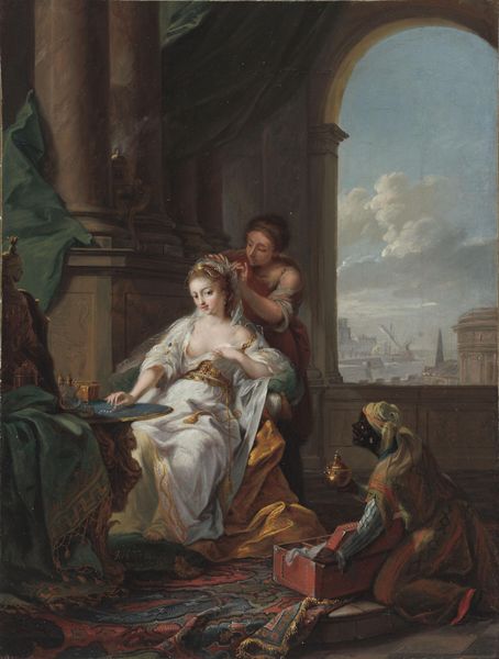 Curator: My first impression is the opulence. All these people attending to Esther, there's such a vibrant yet soft texture. Editor: And a historical insight suggests that what we are viewing is a work attributed to Jean-François de Troy, and the title indicates it is "Esther at her Toilet". Curator: "Esther at her Toilet", fitting given the elaborate preparations underway. The image definitely pulls on common images of grooming and female archetypes within beauty standards. What about you, in terms of symbolism, what does this invoke in you? Editor: For me, there is so much revealed in how beauty preparation rituals signify status. Royal grooming was steeped in symbolism, representing power through carefully orchestrated performances. It has similar cultural weight as the symbols of cleanliness we attach to leadership today. Curator: Interesting, because Troy certainly painted several versions of Esther. So he knew it was an ongoing hit in 18th Century France, to continue painting her repeatedly. One could even call it good financial planning for the artist. The political aspects here are critical, revealing how depictions of powerful women were commodified and controlled. The way we visualize power—and how we choose to consume those images—shapes how we accept social structures. Editor: And not to overlook the potential visual pun. 'Toilet' in the 18th century had much more expansive definitions encompassing washing, hairstyling, applying make-up as we are seeing here. The mirror, absent but heavily implied here, is therefore a symbol of not only superficial vanity, but critical self-assessment of character as well. Curator: Mirrors representing not just our literal reflection, but our social reflection... the judgement by others, even divine judgement. It all folds into this very rich moment in this "toilet" painting, and certainly speaks of the times! Editor: Definitely food for thought as we observe such elaborate self-presentation and its attendant anxieties. It opens avenues to discuss similar struggles reflected even in today's image-obsessed culture. Curator: I'll certainly keep that in mind when recontextualizing this work in the present day. Thank you!