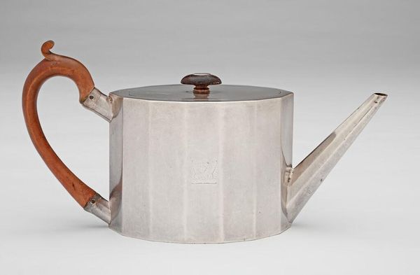 Curator: Oh, my, this "Teapot" looks so stern! It's silver, by Thomas Chawner. The hard edges and that ebony handle give it a rather formal air, don't you think? Editor: It's an aesthetic firmly rooted in its era, and the teapot is more than just a piece of tableware. Tea was central to social and political life, tied to colonial expansion, trade, and even revolution. Curator: Yes! One can almost feel the weight of expectations it carried. And I love the tiny engraved crest—a little flourish of personality on such a serious object. I wonder what stories it could tell. Editor: It speaks of wealth and status, certainly. The labor involved in crafting such a piece, the materials themselves—all indicators of privilege. But that crest, you’re right, hints at individual stories interwoven with larger historical currents. Curator: It's funny how something so seemingly simple can contain so much. It leaves me pondering how much history is contained within it. Editor: Exactly. A beautiful object, yes, but also a potent symbol of power, trade, and the complexities of social hierarchy.