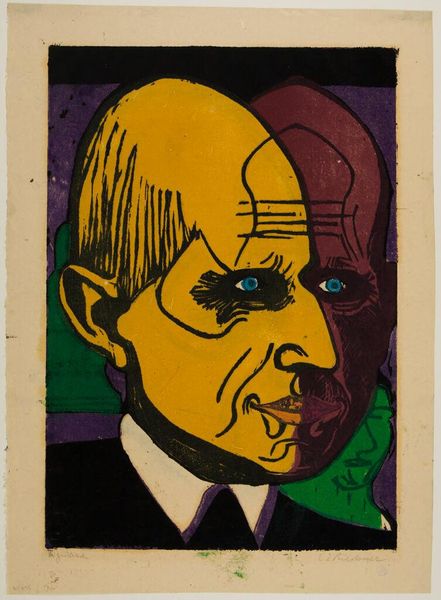 Editor: Good morning. Look at this piece; there's a disquieting energy. The abrupt color shifts almost cleave the subject in two. Curator: Indeed. This is Ernst Ludwig Kirchner's 1933 drawing, "Kopf Dr. Frédéric Bauer," currently residing here at the Städel Museum. Note how Kirchner utilizes sharp linework. Editor: It appears to be a drawing, though it mimics printmaking's graphic qualities. I'm curious about Kirchner's material choice here; paper itself becoming part of the statement. Was this choice due to available materials, or a deliberate move in exploring print aesthetics? Curator: Both are valid considerations. But notice the deliberate composition choices. The subject, presumably Dr. Bauer, is bisected tonally; it creates a stark contrast which amplifies the expressionistic distortion, moving the representation from accurate portraiture towards raw emotional articulation. Editor: True. And I wonder about the physical act; Kirchner's hand wielding the drawing tools, his posture, his concentration. This work wasn’t effortless—each mark, color choice represents time spent, a decision made with both intention and perhaps also improvisation dictated by material realities. How do the social and economic conditions of 1933 inform these aesthetic choices? Curator: Your perspective highlights a deeper engagement with the process. Let’s observe further—the intense gaze achieved through simplified forms and that unsettling color palette contributes to a powerful psychological impact. The lines serve as contours defining shape and also independent agents that energize the composition. Editor: Absolutely. And by choosing drawing, a relatively accessible medium, rather than, say, large-scale painting, Kirchner engages directly with the notion of democratic art making. Materials become tools not only for artistic creation but instruments for social commentary as well. Curator: It appears the seemingly raw and fractured presentation encapsulates the psychological climate of its time. The stark simplicity forces the viewer to confront the fragmented reality it presents. Editor: Thinking about how readily-available, everyday materials were transformed into this forceful image only deepens its resonance for me. This is so much more than simply depicting a likeness; it is an indictment realized via modest means. Curator: Yes, there is a visual poignancy as the technique of drawing intersects with socio-historical reality here. Thank you for these additional material observations.