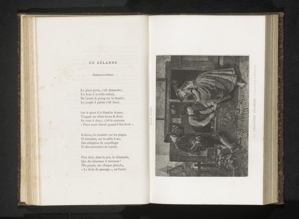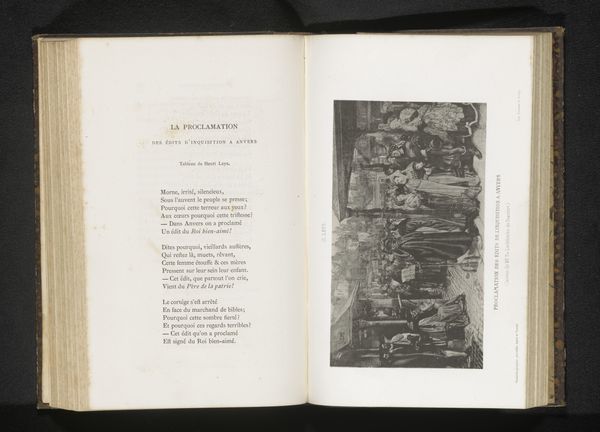 Curator: Here at the Rijksmuseum, we have an intriguing reproduction, likely an etching or engraving, of "Le Croquis" by Jean Baptiste Madou, dating to before 1867. Editor: My first thought? Chaotic and cramped. It’s a snapshot of… something illicit? The heavy lines contribute to a sense of confinement. Curator: Note the contrast. On the left, a dense image. Opposite, you see delicate letterpress on what appears to be aged paper. Someone invested time and skill in the etching and binding. We must also remember, the artwork itself depicts a sketch or “croquis,” hinting at layers of production and reception. Editor: Absolutely. Look at the visual vocabulary— figures tumbling across each other, a sense of bacchanal. This evokes a tradition of symbolic depictions of earthly delights but presented here with a darker tone. There seems to be something about the transience of pleasure captured. Curator: Perhaps it speaks to 19th-century printing techniques. Notice how the print quality, while detailed, adds to the mood through its rough edges and imperfect tonal range. Mass production allowed art and literature to mix. What might a contemporary viewer of this “reproduction” think about consuming art in this format? Editor: Considering "le croquis" suggests a quickly executed drawing, the meticulous engraving process transforms the original gesture. This lends layers of irony and introspection to a scene brimming with implied narratives—figures perhaps sleeping off excesses. They look to be crammed into what I take is the artist's studio. Curator: Very good point! By bringing it into this portable, reproducible format, it invites a dialogue about what is being presented and who could have access. It really encourages considering what these production methods allowed, but also lost from the original artistic experience. Editor: I come away sensing melancholy despite the debauchery depicted, reflecting maybe the artist's unease with fleeting pleasures or perhaps societal anxieties of the era now rendered in ink and paper for our interpretation.