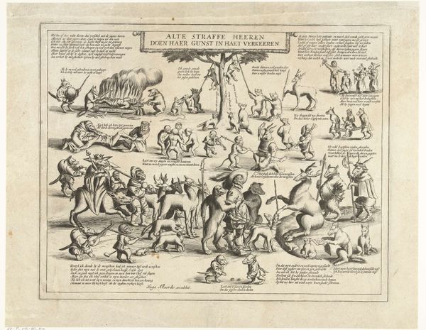 This is a fascinating engraving, "The World, Cage of Fools," created by an anonymous artist. At its heart, we find a globe, the symbol of earthly existence, yet here it’s portrayed as a fragile bubble about to burst. The ladder leading up to it suggests mankind's futile attempts to grasp worldly matters. This motif of the world as a precarious sphere echoes in numerous cultural contexts, from ancient myths of Atlas bearing the world to Renaissance allegories of Fortune’s wheel. In the lower register, one can see a figure bent over and carrying the globe. This image resonates with the myth of Atlas and the weight of responsibility. This is a heavy, psychological burden humanity seems destined to carry. The cage of fools, with its myriad characters engaged in various absurdities, highlights the timeless human folly. This engraving is not just an image; it is a mirror reflecting our collective psyche.