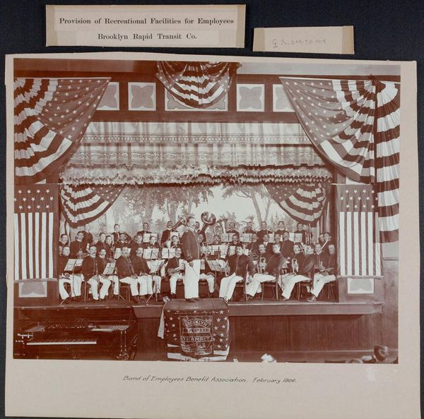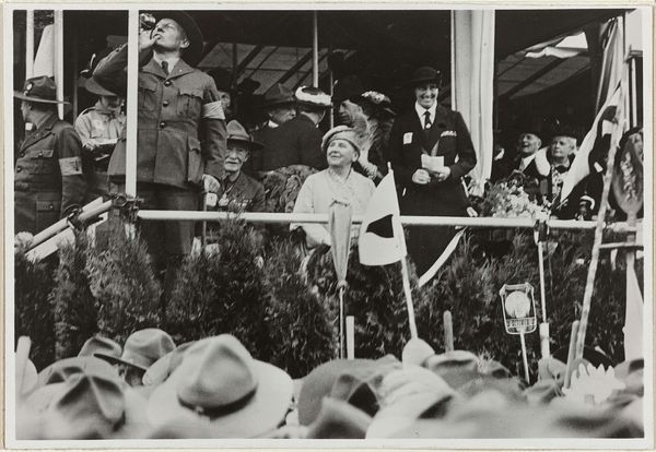 Editor: This is an untitled photograph by Jessie Tarbox Beals, potentially depicting President Taft at the Louisiana Purchase Exposition. It feels incredibly staged, almost propagandistic. What do you see in this piece? Curator: I see a visual articulation of power, wouldn't you agree? Beals, as a pioneering female photographer, captures Taft amidst symbols of American authority. The framing feels deliberate, almost imposing, what narrative does it create considering the historical context of early 20th century America? Editor: It makes me think about the role of photography in shaping public perception and solidifying power structures. Was Beals complicit in that? Curator: That’s precisely the question we need to ask. Considering the limited roles often afforded to women at the time, her access is significant. But does that access come at a price, perhaps reinforcing existing hierarchies? Editor: So, it's about unpacking the layers of power, gender, and representation within a seemingly straightforward image. Curator: Exactly. And understanding how Beals navigated those complexities as a woman in a male-dominated field.