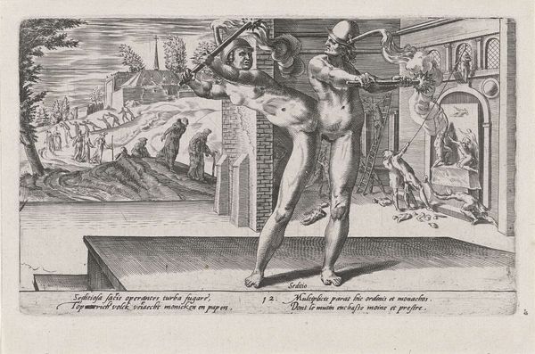 Erhard Schön’s woodcut print, *Underweissung der Proportzion und stellung der possen*, presents us with a lesson on proportion and the human figure. Made in the first half of the 16th century in Germany, a period marked by religious and social upheaval, Schön situates us in a world steeped in the revival of classical ideals and the burgeoning unease of the Reformation. In the print, three male figures occupy a stark, tiled space. One lies prone, while two others stand, seemingly in contemplation or judgment. What can we read in their gestures? Do they represent the artist's exploration of form, or perhaps the social and religious tensions brewing at the time? The nude figures challenge viewers to consider not just the aesthetic, but also the socio-political dimensions of the human form. The artist uses the traditional form of printmaking, a method accessible to many, to share his view of the world. This work invites us to contemplate how we, too, measure up to the ideals of our own time.