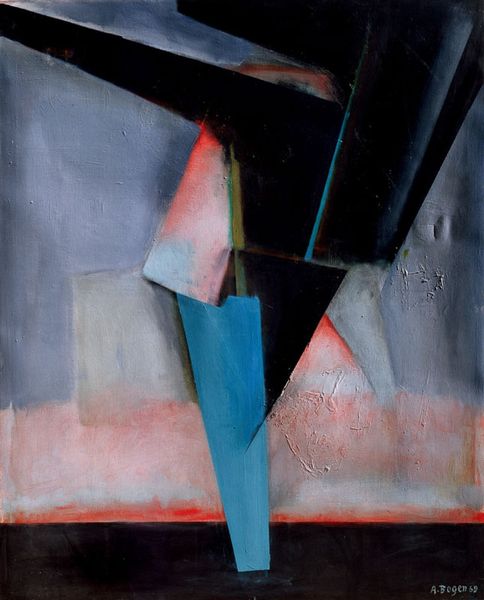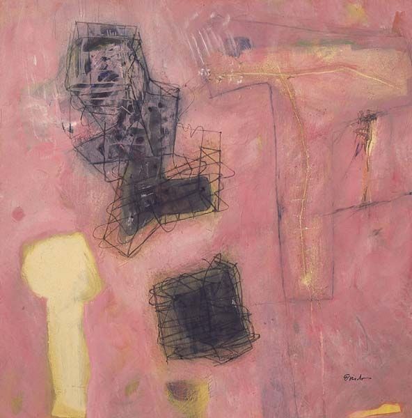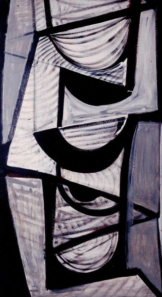 Editor: This mixed-media drawing on paper is "En la Trayectoria del Tiempo" by Ramon Oviedo. There's a real sense of tension and mystery. It feels almost architectural, yet fragmented. What compositional elements strike you most when you look at this work? Curator: I'm immediately drawn to the interplay between the geometric forms and the more expressive, textural elements. Note how Oviedo employs line – not just as contour, but as a binding force. Are these lines trapping forms? Releasing them? Consider the work's structuralist reading—the visible system almost betrays a hidden underlying system we cannot see, the dark, central form at the piece's center—a keystone for our own act of perception. What about the colour, in its formal use? Editor: The colour palette, primarily these muted purples and pinks, creates a surprisingly serene backdrop for such an angular composition. That small spot of red truly pops! Is that dark, almost smudged, rectangle some kind of focal point? Curator: It commands attention, doesn’t it? Visually, it creates a void, a moment of concentrated darkness. However, if it dominates too much, all other formal elements risk subordination. The beauty is that the linear gestures attempt to break it down to balance the composition as a whole, to provide some semiotic meaning behind that black form at the center of it all. In some sense, its opacity challenges our desire for clarity and demands contemplation, doesn’t it? Editor: It really does. The whole drawing makes you consider how different elements can come together to produce anything but stability. I'm seeing the architecture analogy even stronger now! Curator: Exactly! Through astute manipulations of form, material and colour, Oviedo evokes this response perfectly. Its formal elements perform like a linguistic expression of time itself.