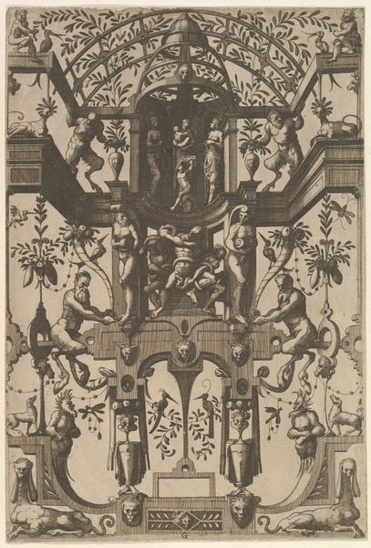 Curator: Ah, this intricate piece by Pieter van der Heyden, titled "Vlakdecoratie, vaas met vruchten en bloemen in een omlijsting van rolwerk," from 1567, is quite something, isn't it? An engraving brimming with Mannerist flair, now held in the Rijksmuseum. Editor: My first thought? It feels like a riddle, almost. A cascade of forms, both organic and architectural, fighting for attention, creating a somewhat claustrophobic yet fascinating space. What's your reading? Curator: I see it as a reflection of its time, really. The Mannerist style loved complexity, playing with perspective and form to create something more than just representational. Consider how the print circulated within artisan workshops, each adapting and remixing van der Heyden’s concepts. Editor: Workshops, yes. I notice the repetition of the vase form… it anchors the piece amidst all the flourishes. Makes me wonder about its intended use, beyond just inspiration. Was this meant to directly influence object design? Curator: Undoubtedly. These prints served as blueprints for craftsmen. Van der Heyden’s work, like many decorative engravings, facilitated the dissemination of style across Europe. It's also a statement of power; the affluent flaunting these extravagant designs. Editor: And those faces peering out from the foliage… they're so haunting! They give the composition this bizarre, almost theatrical air, as if a hidden drama is constantly unfolding just behind the leaves and fruit. It certainly reflects the time's fascination with elaborate ornamentation. Curator: Indeed. The grotesques add another layer of complexity. We are witnessing an intersection of design and culture, really—the values and ideals expressed through the aesthetics of everyday objects. Editor: It makes one appreciate the incredible skill and attention to detail involved, not only in the engraving itself, but also in the conceptual design. This little decorative piece offers a portal into a whole world. Curator: Absolutely. Next time you see a vase from this period, remember that pieces like this one from Pieter van der Heyden played a significant role in its creation.