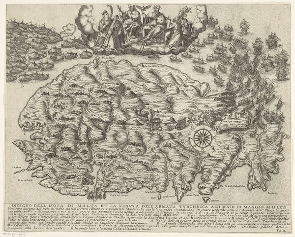 Jean Perrissin’s etching depicts the order of armies in the Battle of Dreux, a key event in the first French War of Religion in 1562. As a bird's eye view, the image presents the two opposing armies, one Catholic, the other Huguenot, meticulously arranged and labelled. The print's detailed rendering of troop formations and weaponry speaks to the period's fascination with military strategy and technology, revealing a culture embroiled in religious conflict. France was deeply divided in the 16th century by religious tensions, and institutions such as the monarchy and the Catholic Church played pivotal roles in shaping the conflict. This print can be seen as a strategic tool, documenting a pivotal moment in the conflict while commenting on the broader social structures of its time. To understand this print better, historians might turn to contemporary military treatises, religious pamphlets, and political documents, offering insights into the contingent relationship between art, society, and institutional power.
