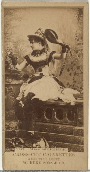 This is a promotional cigarette card of Minnie Palmer, created by Allen & Ginter. The sepia tone lends a nostalgic air, contrasting the textures of fabric and backdrop, all framed within a border. Palmer, holding a violin, is positioned against a backdrop that blurs the lines between indoor and outdoor space. The composition, while seemingly straightforward, subtly undermines traditional portraiture. The muted palette and soft focus disrupt a clear reading of space, drawing attention to the surface of the card itself. This tension between representation and surface reflects broader artistic concerns of the period, particularly the emerging focus on materiality and the questioning of illusionism. The card challenges fixed meanings by presenting an image designed to entice consumption, yet simultaneously inviting scrutiny of its own construction.