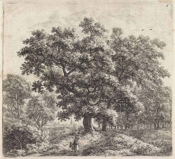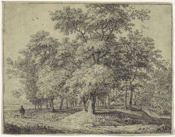 Adrianus Serné created this drawing, "Elswoutshoek by Overveen by Haarlem", using pen and brush in brown and gray ink with gray wash, an exercise in tonal range and compositional balance. Notice how Serné arranges clusters of trees to frame a distant building. The trees on the left, rendered with delicate vertical strokes, create a screen, contrasting with the denser, rounded forms to the right. The composition isn't merely representational; it's a study in contrasts. The lightness of the sky above plays against the increasing density of the foliage, guiding our eye through the scene. This structured approach can be seen as Serné’s engagement with formal elements, the balance of line and tone, of open space and filled space. This creates an aesthetic experience that is both pleasing and intellectually engaging. It is through this careful articulation of form that the artist evokes a sense of place and invites contemplative viewing.
