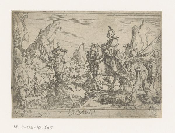Stefano della Bella created this print, "Part of the Entrance of the Polish Legation," in the 17th century, using etching techniques. The print captures a moment of cultural exchange and diplomacy, reflecting the social and political landscape of 17th-century Europe, where formal embassies and royal visits were not just diplomatic necessities, but elaborately staged displays of power and prestige. Della Bella, an Italian artist, was commissioned to document the entry of the Polish delegation, showcasing both the exoticism and the diplomatic importance of this cultural encounter. Visual codes, such as the attire of the figures and the ornamentation of the horses, offer insights into the cultural identities being presented. The artist's choice to focus on the procession highlights the performative aspect of statecraft. By studying period documents, we can better understand the political contexts of this embassy and interpret the print as a representation of intercultural relations.