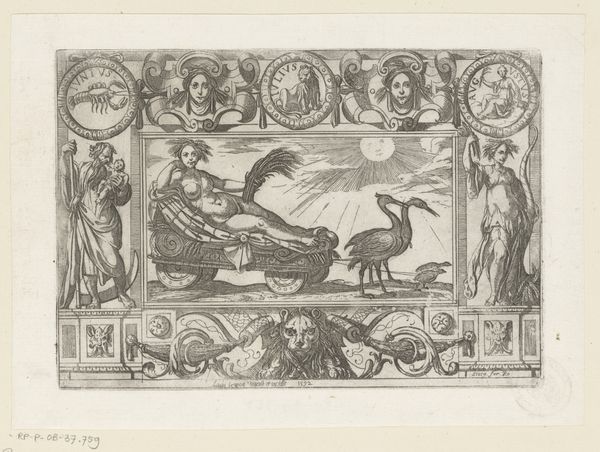 Antonio Tempesta made this engraving called 'Lente,' or 'Spring,' sometime around 1600. It's part of a series about the seasons, full of classical imagery. We see Flora, the Roman goddess of flowers and springtime, riding in a chariot pulled by farm animals. The frame is decorated with putti, garlands, and personifications of the months of March, April, and May. This wasn't just a decorative image. These seasonal series were popular among wealthy Europeans as allegories of renewal and prosperity. Tempesta was working in Italy, where there was a strong tradition of celebrating the agricultural cycle in art. The image also reflects the values of the Renaissance, with its emphasis on classical mythology and the beauty of the natural world. To understand this print better, we could look at emblem books, agricultural treatises, and records of courtly festivals from the period. Examining 'Lente' in its social and institutional context reveals how art served to legitimize the social order.