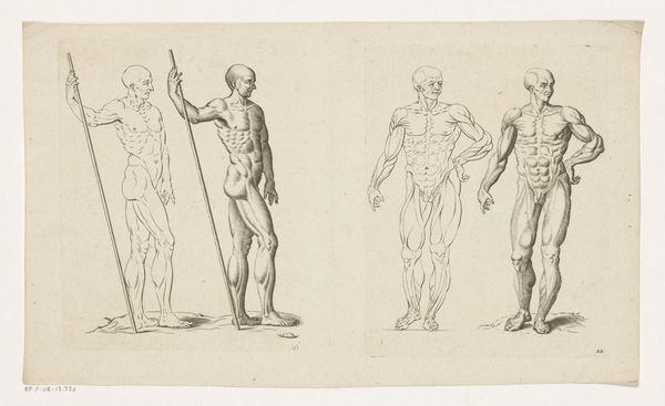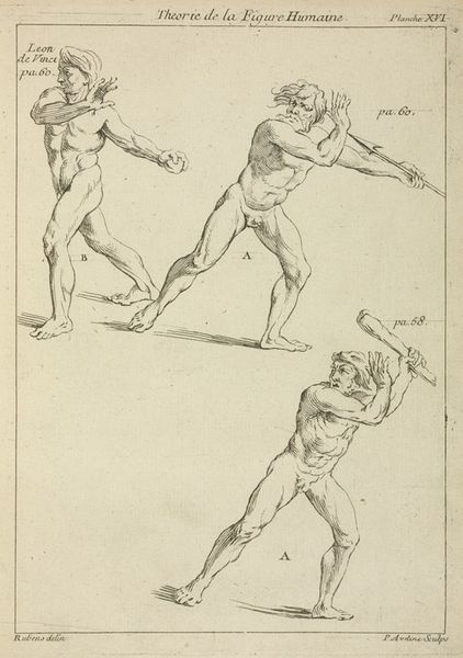 Peter Paul Rubens created this sketch, "Six Male Figures," using ink to explore human anatomy. The composition is arranged as a study sheet featuring several poses, each figure rendered with remarkable attention to the muscular structure and the play of light and shadow, conveying a sense of three-dimensionality on a two-dimensional plane. Rubens was influenced by classical sculpture and Renaissance art. Notice how the figures, while diverse in posture, share a common emphasis on idealized form, characteristic of the Baroque aesthetic. The lines vary in thickness, creating depth, and the shading is achieved through hatching and cross-hatching, techniques used to define contours and volume. The texture created by the ink on paper adds a tactile quality to the drawings, enhancing their visual appeal. Ultimately, this study invites us to consider how Rubens used the medium of drawing not only as a preparatory step, but also as a means of intellectual and artistic exploration.