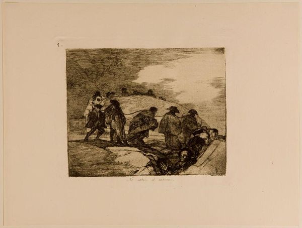 Editor: This etching, "There Isn't Time Now" by Goya, portrays a chaotic scene with figures in conflict. It’s a pretty grim image; what do you make of it? Curator: Ah, Goya. He pulls no punches, does he? I see a snapshot of brutality, a world where survival is a desperate struggle. The darks and lights create a mood of impending doom, that's for sure. Are those defenders, or aggressors, I wonder? Editor: I hadn’t thought of that! It’s hard to tell who is who, isn't it? Curator: Exactly! Goya wants us to question easy answers. It seems like time is running out for everyone involved. It is a sharp commentary on human nature, wouldn't you agree? Editor: I do. It's almost too much to take in, but I'm glad I spent the time. Curator: Me too. Goya always leaves me contemplating.