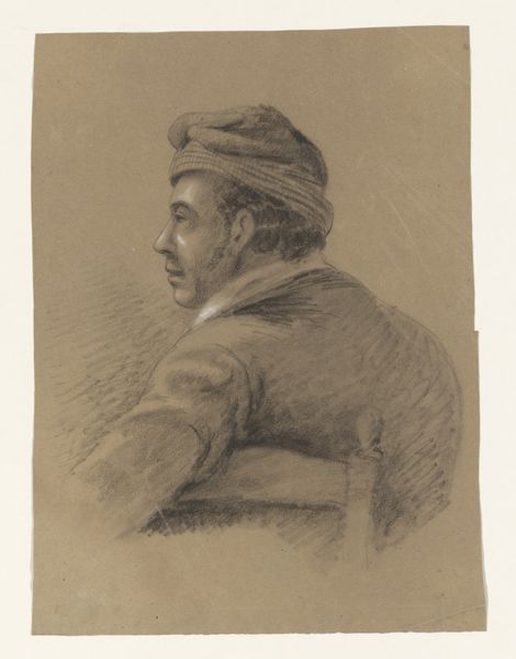 Editor: This is "Military Types, Fantassin Desvignes from Burgundy" by Eugène Burnand. It's a drawing, and the somber expression really stands out to me. What can you tell me about the significance of his imagery? Curator: Look at the "37" on his collar. These small symbols carry immense weight. Consider the helmet, a relatively new form of protection at the time. How do you think it altered the soldier's perceived identity? Editor: It’s strange. It's supposed to protect, but it almost dehumanizes him, makes him less individual. Curator: Precisely. It conceals the individual behind the collective war effort, but then look closer at the eyes, the moustache, those piercing eyes which defy that erasure. Notice how Burnand, even in this straightforward portrait, acknowledges this conflict through a subtle, evocative use of shading and color. Do you see what this tension suggests about early 20th-century views on war and individuality? Editor: It's like the artist is grappling with how war changes a person's identity, both internally and externally. Curator: Exactly! Burnand gives us a Fantassin, a footsoldier, but the imagery makes him unforgettable, beyond a simple depiction. Editor: I see what you mean. I had missed those deeper layers of meaning behind what I initially saw as just a serious portrait. Curator: The weight of history is borne by simple symbols. Seeing how they work shows us the true genius behind works of art like this.