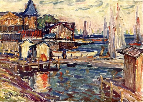 "Quick Frozen Fish, Florida" was made with oil paint in 1959, by David Burliuk, and it's like a party of brushstrokes, all chunky and determined. The way Burliuk loads the paint onto the canvas, you can almost feel the Florida sun baking down on that little shack. The blues of the water and sky are so bright, they’re practically shouting, while the pinks and yellows in the clouds give it a touch of cotton candy sweetness. Look at the lower right corner. The artist’s signature and the year are scratched right into the wet paint. It’s a bold move, like he’s staking his claim on this slice of paradise. Burliuk was a bit of a rebel, and you can see that spirit in his contemporaries like Kandinsky, who pushed the boundaries of what painting could be. This piece is all about the joy of painting, a celebration of color, texture, and the sheer pleasure of capturing a moment in time, quick frozen, just like those fish.