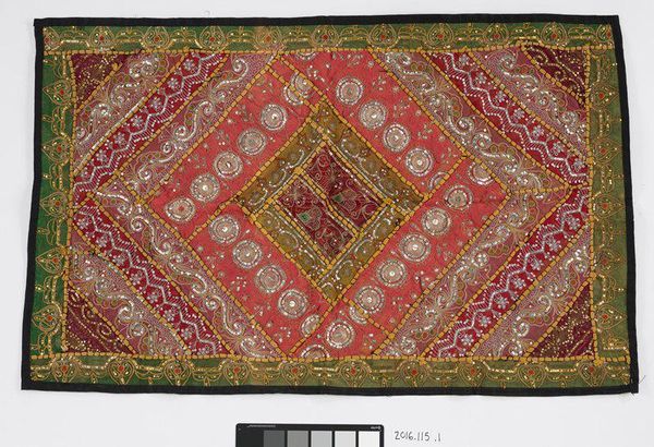 This Tush kyiz, or hanging, was anonymously made around 1960. The wall hanging is made from different types of felted wool with intricate patterns of embroidery. These hangings like this are made by women in Central Asia to commemorate weddings. Here, the black background felt and red border showcase striking embroidery, celebrating the Soviet regime through recognizable buildings in Moscow. Note the towers of the Kremlin, adorned with red stars and a rocket shooting up towards the sky. The center of the wall hanging features an emblem with a wreath of cotton and wheat, with a red banner in the center. The embroidery would have been done by hand, a painstaking process of skilled labor. This hanging is a great example of how craft traditions are used to celebrate labor and politics, while elevating the traditional domestic craft of embroidery to new heights of expression.
