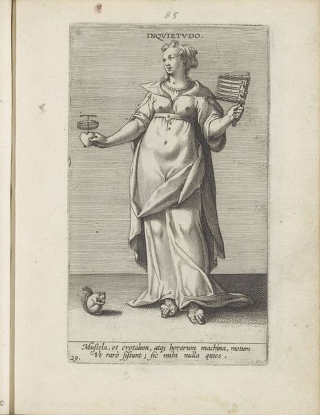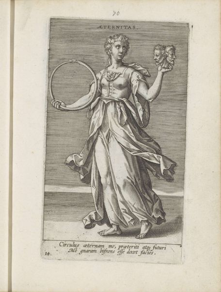 Philips Galle created this engraving, Standvastigheid, sometime between 1552 and 1612. Galle was a printmaker in the Netherlands during a time of religious and political upheaval, a context that greatly influenced his artistic output. This work allegorizes the concept of steadfastness through the image of a woman, Constantia. She stands partially nude, with one hand resting on a column and the other holding a sword over a flame, symbolizing her unwavering commitment to her beliefs. Galle’s choice to depict Constantia as a woman is particularly interesting when considered alongside the period’s patriarchal norms. Does this depiction challenge or reinforce the limited roles often assigned to women? The imagery might be interpreted through a feminist lens, questioning the dynamics of power and representation inherent in such allegorical portrayals. This image invites us to reflect on the intersections of gender, power, and resilience. It encourages us to consider whose perspectives are historically valorized and whose are marginalized.
