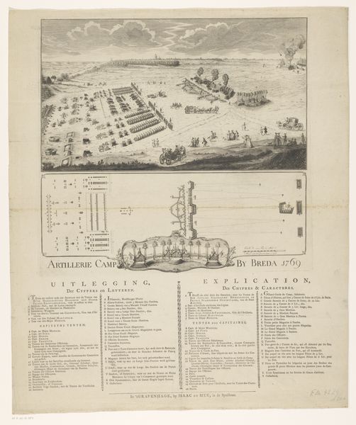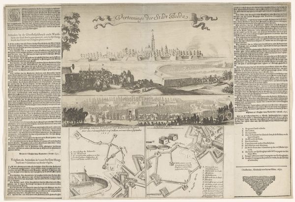 Editor: This is a print from 1752 called "Gezicht op het Buitenhof en het Binnenhof," or "View of the Outer Court and Inner Court," by P.A. de Saint Hilaire Mallet. It depicts a cityscape with lots of descriptive text surrounding it. The composition feels very formal and ordered. What cultural echoes do you hear when looking at it? Curator: This print strikes me as a deliberate attempt to construct a specific image of power and order. Notice how the artist uses perspective not just to depict space, but to communicate hierarchy. The Binnenhof, the seat of government, is meticulously detailed, almost like a character portrait, front and center. Editor: It’s interesting you see it as constructed, not just representational. Can you explain? Curator: Certainly. Consider the prominence of text. It is like a chorus interpreting the significance of what’s visualized. It anchors meaning. Also consider the formal arrangement of trees and water - the Dutch Republic heavily invested in controlling and shaping the natural world, a projection of its political prowess. What emotions do those elements conjure in you? Editor: I see that. The garden design emphasizes control and precision. There's a feeling of... officialness. Almost bureaucratic. But it also seems intended for a specific audience. Curator: Precisely. Prints like this were circulated among elites, reinforcing a shared visual language of status and governance. It visually codified and legitimized their place in the social order. The symbols present affirm and reaffirm societal values for future generations to internalize, influencing self-perception and group identity. Editor: That’s fascinating. I initially just saw a historical landscape, but now I see how meticulously it constructs a narrative about power and cultural memory. It's less of a depiction and more of an…assertion. Curator: Exactly! A carefully crafted visual argument about the enduring legacy of the Dutch Republic. Analyzing its symbolism encourages deeper consideration about the interplay between identity and image across time.