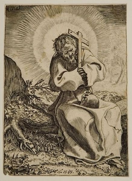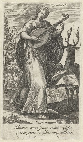 Curator: Hieronymus Cock's engraving, "Musica," created in 1551 and residing here at the Rijksmuseum, presents us with an intriguing allegorical representation. Editor: The sheer detail achieved through the intaglio technique is remarkable! There’s an immediate impression of grace and yet… almost unsettling stillness, don't you think? The precise lines give it a certain emotional austerity. Curator: Precisely. Considering its historical context, music held immense power. It was seen as a force influencing not only human emotions, but also the very order of the cosmos. Musica as a personified virtue represented harmony, something deeply intertwined with social and political ideologies of the time. We also have to read its cultural context—renaissance scholars believed that musical harmony reflected the order of the universe. Editor: The figure certainly dominates the composition. And beneath her we see strewn instruments—a violin-like instrument and a harp along with sheet music—are not merely decorative, but essential to decoding Cock’s structure. They speak of a semiotic framework deeply embedded within this work. The placement creates visual depth and weight. Curator: Indeed! Consider also that women and music had a charged connection during the Renaissance. Musical skill could elevate a woman's status, yet also subject her to scrutiny if seen as overly ambitious or disruptive to societal norms. Editor: The landscape in the background, with its winding river and distant mountains, seems almost detached from the central figure. The landscape offers balance and contrasts with the foreground’s precise linework on musical themes and characters. Curator: A critical tension, mirroring the role of music itself – both integrated within society and standing apart as a transformative force. In terms of its place at the Rijksmuseum, that reflects its importance for education purposes in The Netherlands from an earlier period to understand music's role throughout Western culture! Editor: It gives pause and consideration beyond just the sensory! Curator: Exactly—a cultural lens refracting power structures via art—allowing voices, ideas and values to be challenged in our era and times.