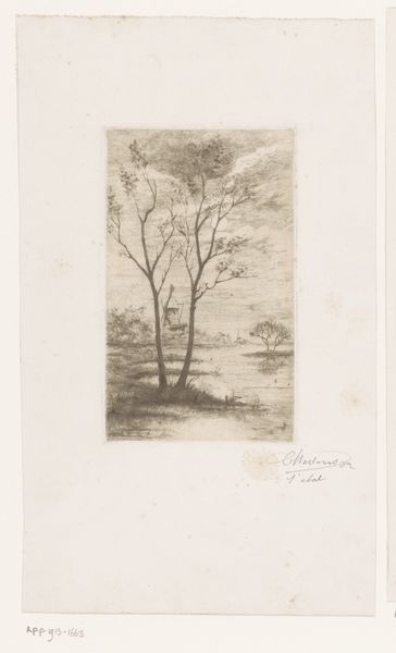 Emile de Baré created this etching, "Groep bomen," sometime in the late 19th century. De Baré, a Belgian artist, captures a cluster of trees with intricate detail. The late 1800s saw significant shifts in artistic focus, particularly concerning the representation of nature. Artists moved away from idealized landscapes, influenced by academic traditions, towards more realistic, immediate depictions. Here, de Baré avoids grandiosity, and instead focuses on the humble, unadorned beauty of the forest. This shift reflected broader social changes, including a growing interest in scientific observation and the natural world. De Baré’s choice of etching, a printmaking technique, allowed for detailed linework that is well-suited to capturing the intricate branches and textures of the trees. The print medium also made art more accessible, aligning with a period of cultural democratization. To understand the full context of this work, it is useful to consult art journals, exhibition reviews, and biographical information on the artist and the artistic circles in which he moved. The true meaning of this artwork lies not just in its visual representation, but in its relation to its social and institutional context.