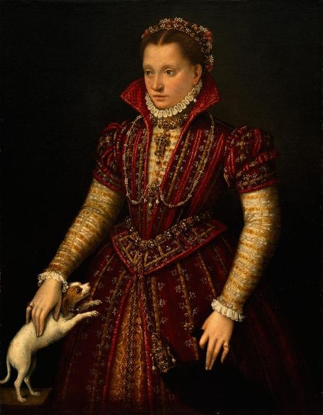Editor: Here we have Frans Hals' "Catarina Both van der Eem," painted in 1620. The oil paint and canvas create this striking, dark scene. It is quite stunning. What strikes me most is how tactile everything looks - that lace collar! What can you tell me about it? Curator: Notice how Hals uses the materials at hand to construct not just an image, but also a narrative of production and consumption. The very texture you mention—that exquisite lace—was the product of countless hours of skilled labor, likely by women. How does that labor challenge the elevated status of the painting itself, as a marker of artistic genius? Editor: That’s interesting… I never thought about the labor involved in creating these elaborate garments! So the portrait becomes, in a way, also a document of those other processes? Curator: Exactly! Look closely. The dark fabric, presumably velvet or a similar costly material, also represents significant economic power and trade networks. The cost of pigment alone! Consider the social implications embedded within these materials and how they reflect Dutch Golden Age mercantilism. Where does that place the art object itself in the wider context of labour and trade? Editor: Wow, looking at it that way, the portrait reveals much more than just the sitter’s likeness. It's really about material culture and how art intersects with social realities. Curator: Precisely! Seeing beyond the surface allows us to engage with the intricate network of labour, material, and social context embedded within even a single portrait. Editor: Thank you; I will always look closely at materials in a new way from now on.