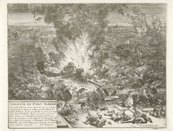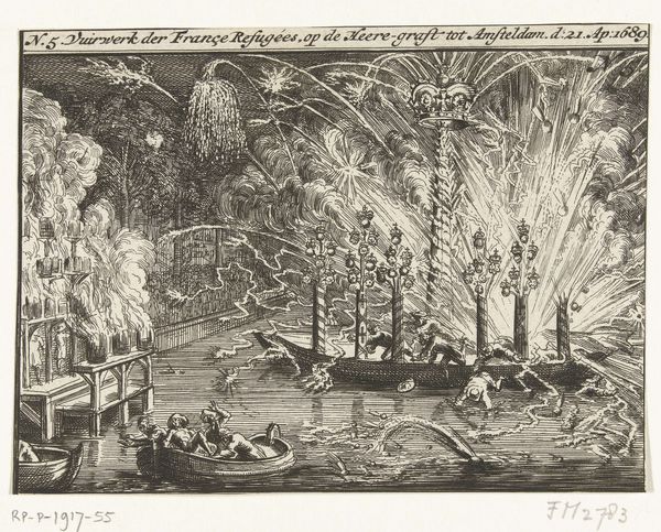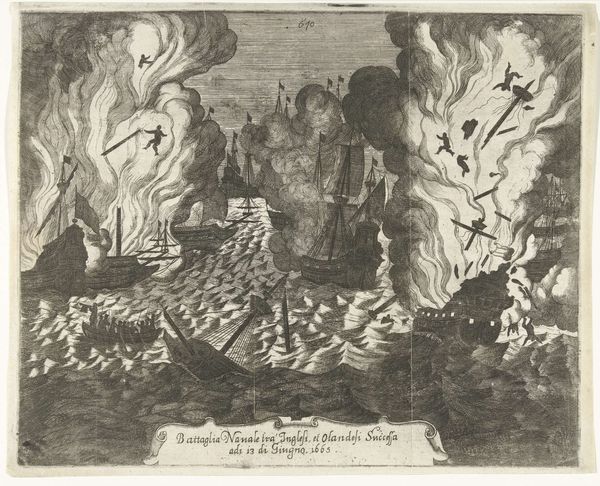 Curator: Talk about a visual drama! Simon Fokke created this etching, "Zeeslag bij Kaap la Hogue, 1692," sometime between 1779 and 1781. Editor: Oh, my goodness. Even in this small print, I feel overwhelmed. It’s chaos, but a compelling chaos. A ship aflame, tiny boats fleeing... a swirl of smoke dominates the composition. I’m sensing a violent but strangely romantic energy here. Curator: Right? Fokke masterfully captures a key naval engagement. You feel the heat of the moment. It’s a classic historical scene depicted with baroque flair. Consider the use of etching: fine, dense lines create this incredible sense of depth and swirling motion in the smoke. Editor: The smoke, it's almost a character, swallowing everything. Smoke is always an indicator of change... the burning ship perhaps representing an old order going up in flames, being replaced by something new, the victor being reborn from these very flames! A total power play depicted as visual storytelling. Curator: That's a beautiful reading, layering historical and cultural meaning. I think Fokke emphasizes Dutch naval power in particular. The Dutch fleet played a crucial role in this victory against the French, securing maritime dominance. Editor: Absolutely! Symbolism, in old battle scenes like this is seldom accidental. There are little details to be observed in naval flags, weaponry, cloud density - or what might be sea foam, and even figures within ships fleeing or conquering that may offer additional nuance. You mentioned baroque earlier, but I also wonder how much influence there may have been on this through the Romantic movement, beginning only a few years before the etching’s creation. Curator: It really captures a pivotal historical event, doesn't it? Editor: It is very thought provoking! It's a moment of transformation preserved in ink... almost as if victory can only rise from destruction.