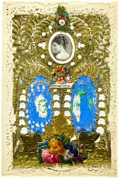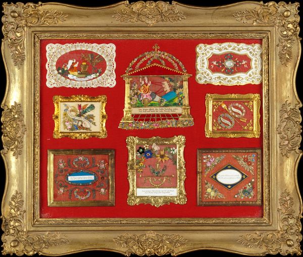 Curator: Sergei Parajanov created "Life and Death of General Radko" in 1983 using a variety of materials in a mixed-media assemblage. My first impression is that its components combine to create a powerful, evocative image with symbolic depth and structural complexity. Editor: Absolutely. There’s a deliberate tension between order and chaos in the arrangement. The frame provides a rigid boundary, yet within it, diverse elements clamor for attention. Curator: Precisely! Parajanov employs contrasting textures—smooth paper against rough organic materials. Observe the placement of objects like the playing cards, banknotes, and photograph: how might these familiar elements be transformed by their juxtaposition? The use of collage gives the overall assemblage an effect of flatness while still maintaining certain depth with the photograph. Editor: These seem to refer to layers of history and power. The Tsarist double-headed eagle looms large, weighed down by currency representing the burdens and ultimate cost of imperial ambition. And isn’t that bell hanging above a portrait, like a call to reflection upon past legacies? Curator: I appreciate that observation, indeed! Consider too how time manifests as a theme in “Life and Death of General Radko.” Not only does time manifest itself in the objects contained, but each component in and of itself may also express an alternate and more profound symbolism of past epochs that were central to Russia. Editor: The dominoes create linear sequences, a rigid, numerical foundation undermined by the disarray of the surrounding fragments. Could this relate to both historical narratives being disrupted as well as an underlying psychological struggle occurring at the base of such an endeavor. Curator: Such a deconstructionist notion adds even more strength! By disassembling cultural symbols, perhaps the intention lies with reassembling a deeper truth about Russia’s psyche. Editor: As we examine the assemblage through this interpretive lens, we are able to deconstruct the imagery presented by the artist on its emotional plane, even within what seems a random series of images. Curator: It shows how a meticulous construction allows complex meaning and the possibility for multiple viewpoints to unfold with consideration and grace. Editor: I walk away seeing more clearly the ways historical context permeates daily and personal experiences, even if veiled at first glance.