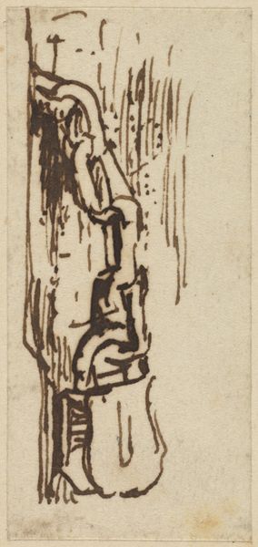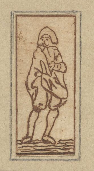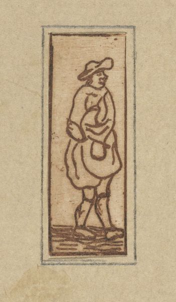 Jacob Hoolaart made this drawing of a standing woman with a hat in the 18th century in the Netherlands. This modest drawing gives us a glimpse into the visual culture of the Dutch Golden Age. Despite its small size, the drawing provides insights into the social norms and values of the time, especially concerning gender and social status. The woman’s clothing and hat, while simply rendered, suggest a certain level of respectability and adherence to social conventions. During this period, dress was closely tied to social identity, and even in a quick sketch like this, we see an effort to convey social standing through attire. The drawing's simplicity invites us to consider the broader context of Dutch art and society during the 1700s. Art historians rely on costume studies, social histories, and archival research to understand the nuances of daily life and cultural values reflected in such works. This helps us to see how art is deeply embedded in the social fabric of its time.
