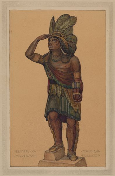 Chris Makrenos created this artwork, "Cigar Store Indian," using watercolor and graphite on paper. The painting presents a full-length depiction of an Indian figure, rendered with careful attention to texture and detail. The figure's pose, shielding his eyes as if scanning the horizon, immediately draws us into a narrative of watchfulness. The use of color – earth tones for the skin and garments, contrasted with the vivid feathers – not only adds visual interest but also emphasizes the figure's connection to the land and tradition. Note how the artist uses line and form to create a sense of depth, particularly in the draping of the shawl and the contours of the face. This work invites us to consider representation. The semiotic weight of the figure is a commercial object and a symbol laden with cultural meaning. It destabilizes fixed notions of identity and authenticity. It prompts us to reflect on how signs and symbols are produced, circulated, and consumed within a given cultural context.