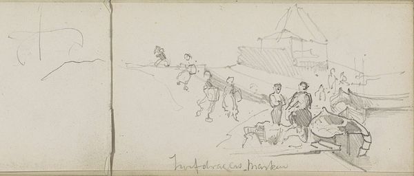 Curator: This is John Singer Sargent's pencil sketch, "Cowherds and Cows at Stream," held at the Harvard Art Museums. Editor: It feels so immediate, doesn't it? The water is so lightly sketched it gives the sense of a fleeting moment by the river. Curator: Sargent often focused on leisure and the pastoral, but how does this sketch reflect the realities of labour in agrarian settings? The cowherds seem almost anonymous figures. Editor: I'm intrigued by the materiality here—just pencil on paper. The sketchiness emphasizes the transient nature of both the scene and the working life depicted. What does this reduction to raw materials reveal? Curator: Perhaps it shows Sargent's privileged detachment. He observes, but never fully engages with the social dynamics at play between humans, animals and labor. Editor: Ultimately, it's a deceptively simple work that raises deeper questions about class and representation, isn't it? Curator: Indeed. It prompts reflection on whose stories get told, and from what perspective.