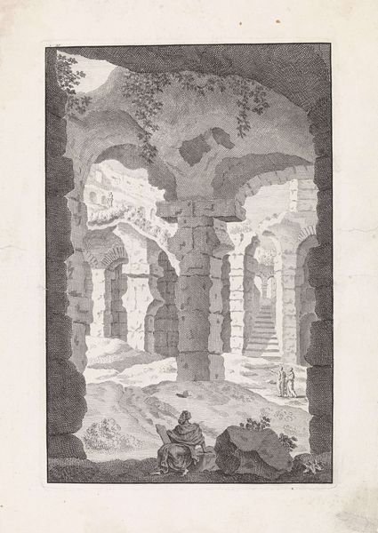 Curator: Jacobus Cornelis Gaal created this engraving, currently residing here at the Rijksmuseum, dating back to 1851. Its titled "Kop van een koe," or "Head of a Cow" in English... Editor: Wait, a cow? Really? Because I'm seeing monumental ruins, possibly Roman, cypress trees piercing the clouds, figures in togas. There's even a cute little dog trotting about! I’m not getting any bovine vibes, are you? Curator: Perhaps that's the clever bit. It’s all about layers of looking, right? On one level, we see Gaal’s reflection on the architecture, those classicizing landscape and history painting styles – grand themes depicted in a delicate medium. Editor: Delicate is the word! I mean, look at that linework – like a spider spun it from moonlight! The contrast is fantastic, pulling your eye straight to the light playing across the crumbling stones. Makes you wonder about the unseen narratives. Curator: Precisely. Consider how Gaal subtly engages with architectural representation at a time when classicism was yielding to realism, how these ruins invite discussion about shifting historical viewpoints. Even that touch of scaffolding on the left—it speaks to cycles of destruction and construction... Editor: Yeah, so is the scaffolding life imitating art imitating life or is it an ugly addition that represents progress marching clumsily forward, trampling history? So where’s the cow hiding in all this philosophical pondering? Curator: Metaphorically speaking, I guess! Gaal could be gently teasing the romantic glorification of the past by grounding the idealized views to more... pastoral, agrarian realities. It prompts questions, surely, about what’s valued in society and in art. Editor: Haha! A-ha! Okay, I am finally onboard! It’s almost like Gaal whispered "Moo" into a history book. Makes the whole thing wonderfully absurd, and now I like it even more. The title acts like a rogue ingredient thrown into a solemn classical stew, disrupting everything... I get it. Curator: I think what Gaal offers here is a window into not only past representations, but on the historical construction of taste. That this unassuming image has this rich and complicated past should offer great food for thought... Editor: So next time I’m feeling pretentious in a museum, I’ll remember the cow lurking behind every classical façade, ready to inject some down-to-earth humor into the scene! Cheers.