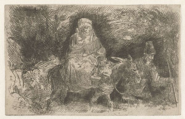 Curator: This etching by Rembrandt van Rijn is titled "Flight into Egypt: Holy Family Crossing a Rill". It captures a moment of biblical narrative, rendered in his signature style. Editor: It feels intimate, almost a whisper. The darkness around them presses in, yet there's this quiet determination in their faces. Curator: The Flight into Egypt is a loaded symbol. Often, the story represents refuge and the preservation of hope during times of adversity. Editor: Yes, and I see that hope reflected in the Madonna's calm posture. There's a powerful maternal resilience there, despite the uncertain journey ahead. Curator: Indeed. It is a testament to Rembrandt's profound ability to imbue religious scenes with human emotion. Editor: It's more than just a religious scene; it's a study of survival, resilience, and the quiet strength of family. Curator: A potent image, resonating with the symbolism of journeys and the search for safe haven. Editor: It leaves me contemplating the quiet bravery in everyday moments, beautifully captured.