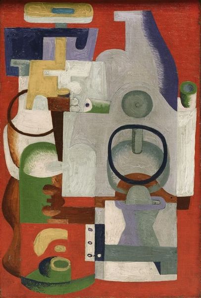 O. Louis Guglielmi's "City Windows" presents a structured yet whimsical composition, likely painted mid-century. The artwork, divided by a bold red grid, offers a fragmented view where domestic interiors meet urban exteriors. Flat planes of colour, from muted greens to vibrant blues, create a patchwork effect, while geometric shapes, like triangles and rectangles, define buildings and objects with an almost childlike simplicity. The painting's strength lies in its structural play. The grid doesn't just divide, it also connects disparate elements, creating a dialogue between the interior still life and the exterior cityscape. We see tulips in a vase juxtaposed against abstract representations of urban architecture. This deliberate flattening and re-arrangement of space challenge traditional perspective. Ultimately, “City Windows” is an exercise in semiotic reduction. Guglielmi reduces the visual world to a set of signs, inviting us to decode the relationships between the domestic and the urban, the natural and the constructed. By simplifying form, the painting opens itself to multiple interpretations.