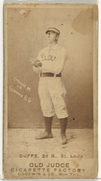 This photographic card, produced by Goodwin & Company, presents Fuller, a shortstop for the St. Louis Browns. The image captures him mid-game, his stance echoing the anticipation of action. Notice the baseball bat he holds. It is not just a piece of sporting equipment; it becomes a scepter of sorts, a symbol of power and skill in this arena. Across cultures, bat-like forms appear, from the ceremonial clubs of ancient civilizations to the staffs of religious figures, each signifying authority and control. The circular form of the baseball itself, caught in mid-air, also carries weight. Circular motifs, like mandalas or halos, recur throughout history, representing totality and the eternal. This simple ball, then, elevates the game to a level of symbolic play, tapping into a primal human fascination with spheres, and their endless possibilities, turning a simple ballgame into a timeless dance of skill and chance.