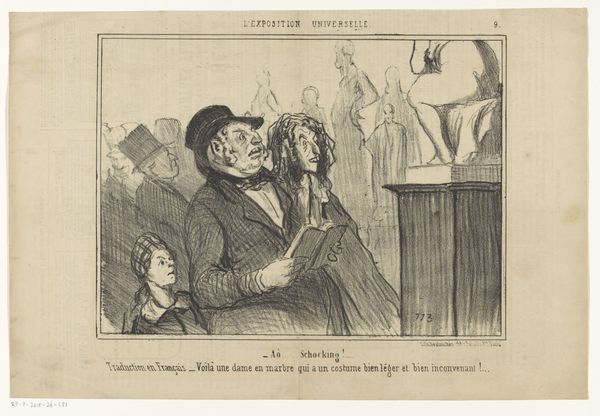 Editor: This is Honoré Daumier's lithograph, "C'est l'apollon du nouvel opéra," from around the 19th century. It seems to capture a moment of humorous observation. I'm struck by how the two figures in the foreground contrast with the statue they are viewing. What draws your eye in this piece? Curator: For me, the interesting point lies in the materiality of this piece. It is a lithograph. Let's consider the means of production, of printing and disseminating commentary for mass consumption. What does the print medium itself tell us about the social context, the artist’s intention, and its reception by a contemporary audience? Editor: Well, it would allow for wider distribution, right? To reach more people with Daumier's perspective. Was he challenging a certain class or artistic sensibility with his work, making art accessible beyond elite circles? Curator: Exactly! He utilizes printmaking to democratize his satire. And think about the subject: it critiques the monumental art associated with the "new opera," linking it to social commentary and perhaps questioning the values of those who champion it. Consider the labor involved: the physical act of creating the stone matrix, the printing process. Editor: So it’s not just *what* is being depicted but *how* it's being made and distributed. Is he elevating a “lower” form, the print, to comment on high art, this Apollo statue? Curator: Precisely! He blurs the lines, collapsing hierarchies, using the means of production to democratize critique itself. This connects to a larger dialogue about class, taste, and the consumption of art during the period. What happens when art comments on art, made with different material processes, meant for different audiences? Editor: I see now how examining the medium reveals so much more about Daumier's social commentary than just looking at the image alone. The context of its making is key. Curator: Indeed, it offers a profound lens for understanding not only art but society itself.