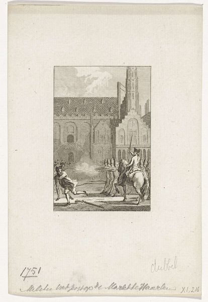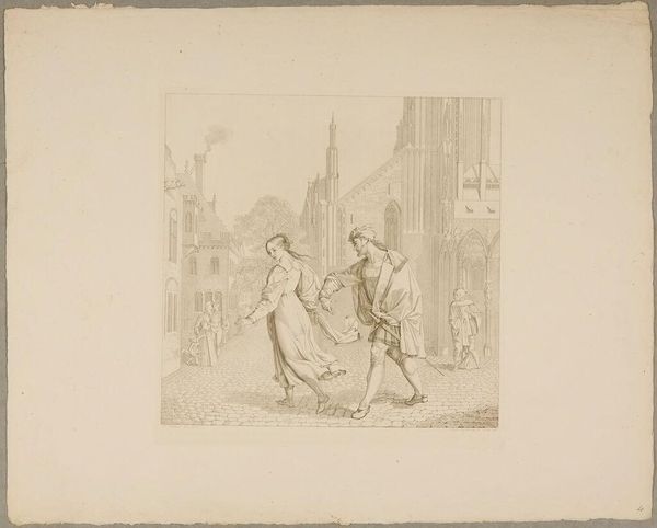 This etching, made in 1785 by Reinier Vinkeles, depicts unrest in Meppel. The central motif is violence: men in the throes of conflict, one wielding a long object, perhaps a stick, against another who stumbles backward. Consider the act of striking. Its recurrence echoes through time, from ancient friezes showing battle scenes to Renaissance paintings of martyrdom. Each repetition, each iteration, carries the weight of its predecessors, yet morphs to reflect its own era’s concerns. Here, the violence is not heroic but rather chaotic and unsettling. Our collective memory and the subconscious recognition of such scenes evoke a sense of unease, tapping into primal fears of disorder and aggression. This image does not merely depict; it stirs, prompting reflection on humanity’s cyclical dance with conflict. The struggle for power, be it physical or ideological, continues to manifest in new forms.