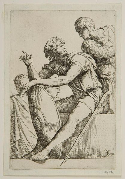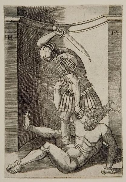 Editor: This is Hans Baldung’s "The Bewitched Groom." I find the woodcut unsettling, with the groom in such an awkward position and a horse looming above him. What symbols do you notice in this piece? Curator: The horse itself is a potent symbol. Consider its duality: a symbol of nobility and power, yet also primal instinct. Doesn't its presence here, looming over the incapacitated groom, suggest a disruption of natural order? What about the witch? Editor: She seems to be celebrating, which feels very ominous. Curator: Indeed. Witches in Baldung’s time were often seen as figures who could invert social structures. Does she not represent the disruption of marriage and the societal expectation of male dominance? What does this reveal about the culture of the time? Editor: So, the image reflects anxieties about social order and power? Curator: Precisely. Baldung uses these symbols to tap into deeper fears and beliefs, revealing the psychological landscape of his era. Editor: I see the symbolism now. The piece feels less random and more a reflection of its time.