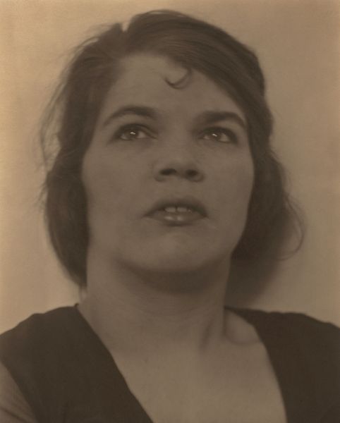 Editor: This gelatin-silver print, titled "Georgia Engelhard," was created around 1922 by Alfred Stieglitz. I am struck by the strong contrast and shallow depth of field. What draws your eye in this portrait? Curator: The interplay between the geometric and the organic is quite striking. Note how the sharply defined stripes of the sitter's garment create a planar surface, boldly contrasting the soft, out-of-focus foliage in the background. Consider also the subject’s soft hairstyle that juxtaposes her direct gaze. Editor: I see what you mean. So the tension comes from those contrasting forms? Curator: Precisely. The strength of the work resides in how Stieglitz manipulates tone and texture to generate that tension. Examine how the light caresses the planes of her face, delineating form with subtle gradations. It’s a delicate balance between clarity and abstraction. How does this distribution of light inform the composition as a whole? Editor: Well, it makes her face the clear focal point, directing your eye there first, even against the busy shirt. Is that contrast meant to communicate something specific about her, perhaps? Curator: One might consider how these formal devices, seemingly devoid of direct symbolism, instead construct a certain visual presence for the sitter. What impression does that create, independent of external references? Editor: That the form itself carries meaning. It makes you really consider the pure structure of the photograph and how that shapes the viewer’s understanding. I had not considered it from this perspective before. Curator: Indeed. Focusing on these fundamental formal aspects provides a deeper, potentially more nuanced understanding of the artwork.