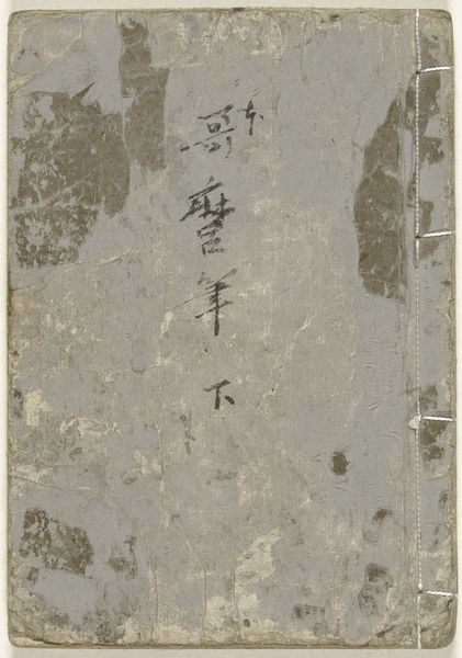 Curator: Let’s turn our attention to a rather intriguing piece: a Shunga album created by Kitagawa Utamaro in 1798, now held in the Rijksmuseum collection. Specifically, this is "Prentenboek over gewillige vrouwen - deel twee"—or, a picture book about willing women, part two. Editor: At first glance, the distressed texture of the textile cover immediately draws the eye. There is a fragility implied, a physical vulnerability in marked contrast perhaps with the artwork's explicit theme? Curator: Indeed. Ukiyo-e prints often carry multiple layers of meaning, playing with societal norms. We see here not just a scene but rather symbolic performance embedded within its cultural context. The intimate scenes, executed as meticulously crafted prints on delicate paper, acquire a symbolic significance reflecting desires, social status, and humor. Editor: Considering the visible materiality and composition, the cover serves almost as an abstract painting—the off-white label disrupts the gray field, offering textual elements in vertically stacked characters. It acts as a visual signifier of the artwork’s narrative potential, before we even consider its thematic core. Do we see any signs of color beyond shades of gray? Curator: Barely, it appears largely monochrome. This restricted palette directs the viewer's focus toward the line work and the dynamic compositions of the figures depicted inside, a common attribute in Shunga art of this era. Line is really the defining factor. But back to your point - it has served many roles from educational to political and more broadly, simply artistic. What interpretations can you bring to mind when looking at this? Editor: Given its genre, perhaps it explores ideas of pleasure or transgression within a rigidly stratified society? These scenes often challenged conventional social mores while simultaneously reaffirming existing power dynamics, a complex paradox that warrants careful examination through an art historical and psychoanalytic lens. It's like a mirror reflecting social attitudes towards gender and sexuality. Curator: Precisely. Shunga prints can unveil repressed aspects of a culture’s collective unconscious, illustrating both desires and anxieties related to intimacy and societal norms. As a historical object it is an intriguing synthesis. Editor: I agree; it really showcases the intersection of technique and the evocative potency inherent in art that is both intimate and public. Curator: Absolutely, a visual whisper across time, holding echoes of untold narratives.