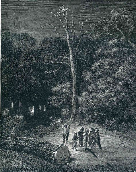 Curator: This drawing is titled Idylls of the King by Gustave Doré. The atmospheric landscape, with its dramatically lit night scene, comes from a series of illustrations Doré produced based on Tennyson's Arthurian poems. Editor: It's immediately striking! The stark contrast between light and shadow is so intense, it feels almost theatrical. There's something ominous in the way the forest seems to swallow the figures whole. Curator: That drama is typical of Doré's style, really. He thrived on creating these incredibly detailed scenes that evoked a sense of the sublime. The romanticism of the time, with its interest in wild landscapes and powerful emotions, heavily influenced him, as you can see here. Editor: It makes you wonder about power and its exercise. This small band of warriors seems ready to hunt or attack at any moment. But who or what is their target? What assumptions are embedded here about legitimate violence? Curator: Absolutely. Consider the social context, though: Doré was creating these images for a largely privileged audience in Victorian England. Arthurian legends, by this point, were being used to evoke notions of British moral authority and historical destiny, which absolutely colors Doré's representations of knightly quests and chivalry. Editor: But even within that framework, there’s room for critique. Tennyson's poems are rife with tragedy, failure, and the fallibility of even the noblest characters. So while Doré is certainly contributing to a grand narrative of British identity, I’m not sure it is necessarily uncomplicated. The pervasive darkness hints at the darker aspects of nation building and the sacrifices it demands. Curator: That's a great point; this ambiguity highlights the power of art to be both celebratory and critical, a tension so many artists struggled with in that era. Editor: Yes, looking closely we see an opportunity to think more about how the creation and deployment of these historical narratives shaped, and continue to shape, cultural perceptions of national identity and authority. Curator: Thanks for sharing that perspective, that adds layers to our understanding of this drawing. Editor: Agreed, it makes you realize that these images contain histories within histories, revealing power and resistance intertwined.