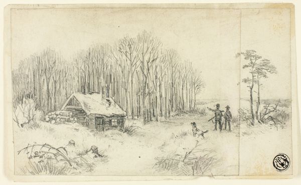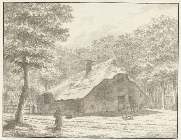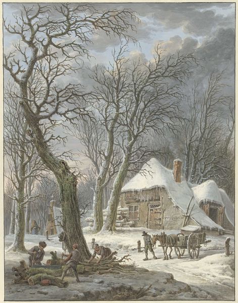 Editor: This is Jacob Cats' "Farmyard in Winter," made around 1786 using watercolor and drawing techniques. There’s something very serene about it, despite the barren trees and cold landscape. What captures your attention in this scene? Curator: The winter scene, rendered with such delicate strokes, is not just a landscape; it's a repository of cultural memory. The thatched roofs, the bare trees, even the activity of the figures all speak to a specific understanding of nature and rural life in the late 18th century. Consider the pig foraging in the snow. How might that simple image resonate with contemporary viewers familiar with agrarian life? Editor: I hadn't considered it that way. It just seemed like part of the scenery. Curator: It's more than just scenery. Pigs have long been symbols of sustenance, but also of impurity. In this context, its presence can symbolize hardship, where even survival is a matter of foraging. What feelings does that evoke, thinking about how animals function as signs of the times? Editor: A bit somber, I suppose. It’s interesting to think about everyday elements carrying such symbolic weight. The composition is also quite striking – how the boat-like structure divides the view, do you think it is intended for symbolic meaning? Curator: Absolutely. Watercraft and shipbuilding serve as metaphors for journeys, life's voyage, and the reliance on trade. Perhaps also a symbol of hope, of surviving through the harsh winter and building towards a more promising season? Cats captures how these images embed continuity in rural existence. It suggests the cultural endurance, even during times of Neoclassical upheaval. What has stood out most for you so far? Editor: Definitely seeing the layers of meaning within seemingly simple images, and how the mundane connects to larger cultural ideas. Curator: Precisely. It's about seeing the everyday as extraordinary. The weight it carries enriches our understanding of the era.
