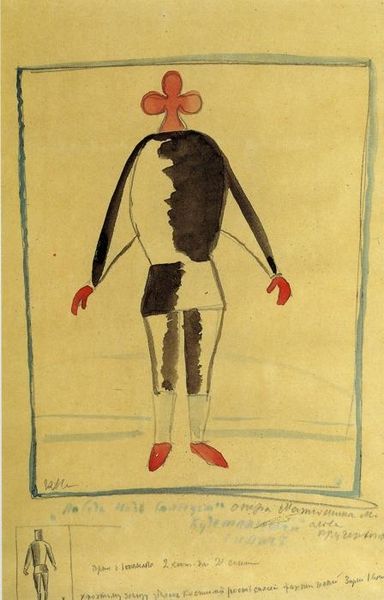 Curator: Here we have Boris Kustodiev's "The Guy from Tula," rendered in 1926 using watercolor and colored pencil. What jumps out at you? Editor: Mischief. Sheer playful mischief. The elongated hat, that almost defiant stance, the slightly chaotic patterns… It’s as if the artist captured a moment of pure, unadulterated theatricality. Curator: It’s a portrait, but the medium gives it a sketchbook quality. Kustodiev employed the loose fluidity of watercolor, adding the precision of colored pencil. Editor: The Russian avant-garde, right? This feels aligned. Avant-garde always aimed to break away. Are those clouds behind him? Almost as if he might just float away. Curator: There's a duality present, with this grounding in a defined region balanced with avant-garde freedom of representation. Perhaps, Kustodiev wanted to depict this person not as someone, but rather an archetype representative of the place. The colors are also quite muted and rustic. Editor: I am instantly drawn to all those small details. I like to focus on details – those symbolic objects – because I see images as potent vessels. It feels like a folk costume almost turned costume. See those dotted feet... Is that an invitation to lightness and whimsy or rather a commentary about cultural roots? Curator: Well, that ambiguity might have been Kustodiev’s intent, don't you think? His distinctive style incorporated theater, vibrancy, a satirical eye, so it's possible that both folk roots and theatrical flair coexist in this very composition. It gives this person, who's unnamed to us, a stage on which to exist, suspended between representation and performance. Editor: In this piece, Kustodiev prompts us to really question the person's story behind a single watercolor. Curator: Absolutely. His technique marries that playfulness with something substantial. We leave with much more than a portrait: it is a fleeting yet lasting performance.