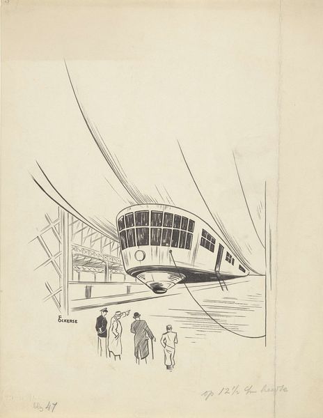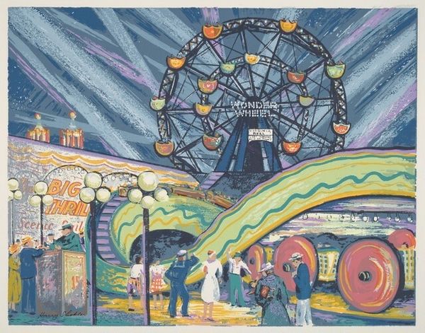 Editor: This linocut print from 1935, "The Tube Station" by Cyril Power, presents a fascinating view of a London Underground platform. I’m immediately drawn to the contrasting colours and the almost dizzying use of perspective. What can you tell me about how we can interpret this piece? Curator: The most striking thing is how Power captures the energy and dynamism of modernity, using the iconic imagery of the London Underground. Think of the psychological impact of commuting – the ebb and flow of people, the fleeting moments of connection and isolation. Does the use of colour and the repetition of curved forms evoke that feeling for you? Editor: Definitely, there is a real sense of movement! And is that red the carriages and people blurred by their velocity? I’d say so, yeah. How would this tube station fit in with a wider historical understanding of the British population and London society? Curator: Mass transit systems became powerful symbols. They represent the collective experience of urban life and also this anxiety of losing oneself within a crowd. Power’s emphasis on geometric abstraction speaks to the modern desire to streamline and make efficient. The symbolism is also, for me, about the British character. What about you? Editor: Right! So a place of community, yet also separation. Plus, the colour and abstract geometry make the whole image feel very streamlined. Thank you. Curator: Of course. The print encourages us to reflect on how technological progress has shaped both our physical environment and our shared social consciousness.