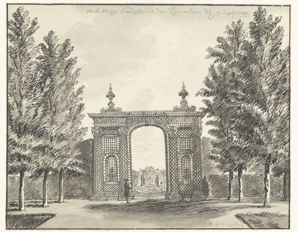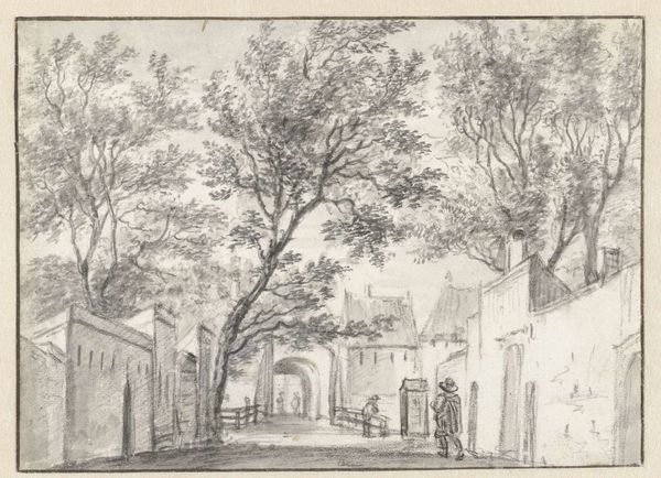 Curator: Here we have Daniël Dupré's "Arch of Drusus in Rome," created in 1789 using ink and etching techniques. It's a rather captivating cityscape. Editor: It really is. The first thing that strikes me is the interplay between the stark, monumental architecture and the encroaching wilderness. It feels melancholic. Curator: That's insightful. Dupré, working in the late 18th century, captured a moment when Neoclassicism and Romanticism were intertwined. The arch itself, a vestige of Roman imperial power, stands as a symbol of order and history. Yet, the way nature reclaims it speaks to a transience, perhaps even a critique of empire. Editor: Precisely! Look at the meticulous detail in rendering the arch's stones against the looser, almost frenzied lines describing the foliage. There’s a tension between control and chaos, mirroring larger social and political shifts. Was this a conscious commentary on power structures being undermined or in decay? Curator: Dupré's position is hard to pin down. Artists of this period grappled with antiquity in complex ways. For some, Rome represented an ideal of civic virtue and artistic achievement to be emulated. For others, it was a cautionary tale about the rise and fall of civilizations. The arch as ruin highlights the inevitable decline. Editor: And there's the human element – the figures passing through the arch. They're small, almost insignificant, further emphasizing the monumentality of the past, but also suggesting a continuation of life despite the ruins. Who do you think these subjects represent? Curator: Likely everyday Roman citizens, unaware, or perhaps indifferent to the deeper historical weight of the arch. I'd argue their relative smallness is Dupré’s way to indicate scale, offering contrast to emphasize architectural prowess, a hallmark of classical-realist artistic depictions in the late 18th-century. Editor: Perhaps, but there's also an aspect that can indicate marginalization. The common person walking towards the arch in order to take on it's role in Rome is being diminished by it’s architecture and imperial might. In a revolutionary context of liberty this imagery takes on a potent undertone of challenging such structure in pursuit of the ideals of democracy. Curator: A compelling alternative interpretation. Ultimately, Dupré’s work invites us to contemplate our own relationship with history and power. Editor: Indeed. It's a conversation between past grandeur and present realities that resonates profoundly even now.