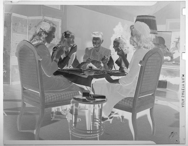Curator: This photogram, currently titled "Untitled (men playing cards)" in the Harvard Art Museums’ collection, captures a moment of leisure. It’s attributed to John Howell. Editor: It’s striking how the negative image gives this an almost spectral quality. The men gathered around the table seem suspended in time. Curator: Card games are potent symbols of chance and fate, reflecting deeper anxieties around risk, reward, and social hierarchy. What stories are being played out here? Editor: I'm interested in the material reality—the table itself, the cards, the photographic process. It speaks to a specific class engaging in leisure afforded by their socio-economic position. Curator: The act of playing cards can be seen as a microcosm of societal dynamics, mirroring power structures and the human desire for control. Editor: And the photographic medium itself—how it both documents and obscures the truth of that moment. This image provides a material connection to the past. Curator: It’s fascinating how even a simple game of cards can hold such layered meanings. Editor: It makes you wonder about the tangible conditions that allowed such pastimes to flourish.