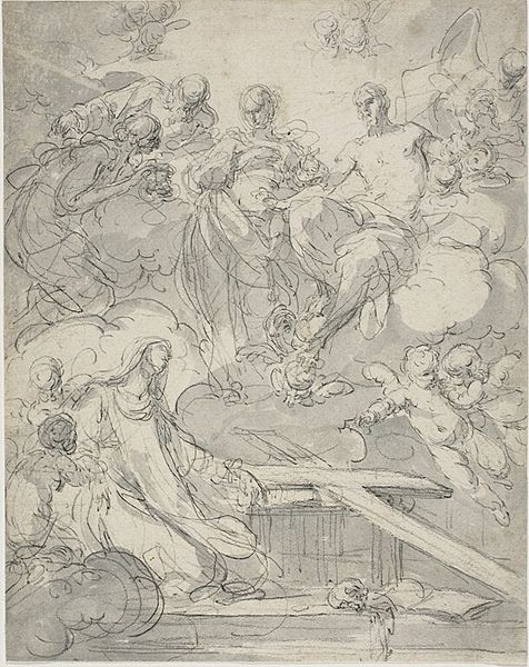 Bartolomeo Biscaino made this print, titled "Christuskind aanbeden door drie engelen", sometime in the mid-seventeenth century. It’s a delicate etching showing the infant Christ adored by angels. The imagery here draws on a long tradition in Italian art, powerfully shaped by religious institutions. Biscaino’s native Genoa, the probable location of this work, was then a Republic, but was also heavily influenced by the Catholic Church and its artistic patronage. The print’s relatively small size suggests it was made for private devotion rather than for display in a church or public space. Prints such as this one circulated widely and were important in spreading artistic ideas. Biscaino, who died young, came from an artistic family and would have learned his skills in a workshop. We can imagine him selling prints like this to collectors and religious orders. It’s a reminder that art history is also the history of social networks and economic exchange. To understand this work more deeply, we might research the religious culture of Genoa in the 1600s or study the print market of the time. The meaning of art, after all, is always shaped by the society around it.