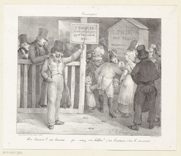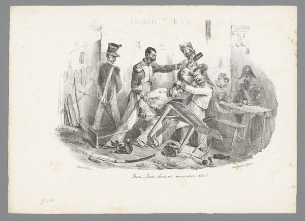 Jean Ignace Isidore Gérard Grandville created this lithograph, "Aanval van de Franse overheid op de vrijheid van drukpers" which translates to "Attack by the French government on the freedom of the press". The composition is a study in controlled chaos. The eye is immediately drawn to the center, where the printing press stands as a symbolic bastion, though it's being violently besieged. Grandville masterfully uses a monochromatic palette to heighten the drama, relying on stark contrasts to define forms. The aggressive diagonals formed by the soldiers' weapons and the fleeing figures inject a sense of dynamism, disrupting any semblance of order. The lithograph employs a semiotic language of conflict. The broken equipment and the fallen flag act as potent signifiers of the suppression of free expression. The artist uses structural oppositions, such as order versus disorder, and freedom versus oppression to reinforce the print's narrative. Grandville's work functions as a socio-political critique, using form to challenge established power structures. It highlights the press as a battleground for ideology.