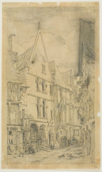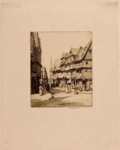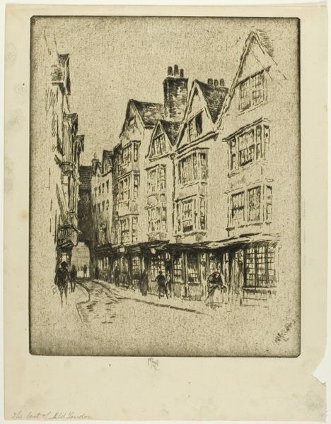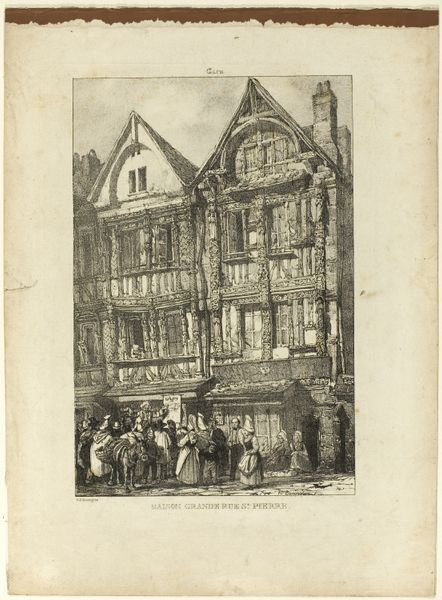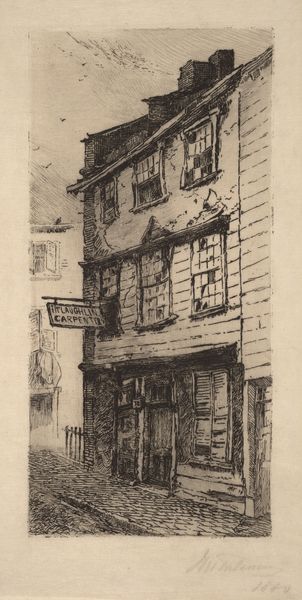 Curator: Look at the light in this, the way it carves out such character in such ordinary subjects. Editor: It's kind of haunted, isn't it? Beautifully, meticulously haunted. Curator: Indeed. This etching is "An Old House, or The Musician's House, Bourges," crafted by Charles Meryon in 1860, you can currently find this print at The Met. Meryon, fascinating figure, captured not just a building, but the very spirit of old Bourges. He felt it deeply, it was the subject of many prints, as you can see. Editor: The lean, that roofline practically collapsing, but somehow still so robust? I find that intensely compelling—how something aged can remain so striking. Do you think he made it this way to signal how life also is; broken but keeps walking? Curator: I believe Meryon was profoundly concerned with time and history. The textures alone of the aged timber tell a story. Also, these were subjects he felt very personal about; Meryon felt empathy towards vulnerable people and objects. This place also represented a kind of pre-Haussmann, about-to-disappear memory. Editor: I see that so evidently—the details, they’re like carefully chosen words in an ode, and the composition as a whole reflects how important it was to document things; to be accurate and sincere. There are several barrels that appear to sit empty, in front of the entrance. Are they waiting to be filled? Or are they from another era already? Curator: That's where his brilliance lies: in the ambiguity. Look closer—are they symbols of the past about to crumble or relics ready to continue and survive into modernity? They are containers. Meryon lets the viewer decide. The Romantic and Realist elements at play invite each of us into his private feeling of nostalgia, and even fear of change, for a passing culture. Editor: The symbolism woven through this is quite something, offering so many ways to understand its narrative and the life lessons within, with a beautiful aftertaste to ponder and chew over later on. Curator: Indeed, an ode to a place and time, leaving a beautiful melancholy trace behind.